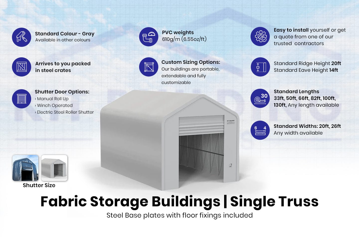 - Fabric Materials: We offer a 5-year product warranty on our PVC 23 oz/sy (610g/m²) external building fabrics, covering you against material defects. Kit Buildings